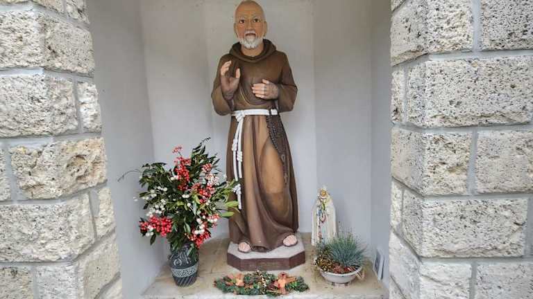 Eine fast lebensgroße Statue des beliebtesten Heiligen von Italien befinden sich östlich von Pfaffenhofen in dem Gebetspark Marienfried. Francesco Forgione, so der bürgerliche Name von Pio von Petrelicina (bekannter als Pater Pio) wurde am 25. Mai 1887 in Pietrelcina, Provinz Benevento geboren und verstarb am 23. Sespt. 1968 in San Giovanni Rotondo, Provinz Foggia. Er war Kapuzinermönch und Ordenspriester als am Körper des damals 31-Jährigen am 29. Sept. 1918 auf einmal Stigmata zeigten. Große Narben an den Handflächen, beiden Füssen und seitlich am Brustkorb. Papst Johannes Paul II sprach Pater Pio 1999 selig und 2002 heilig. Bereits zu Lebzeiten entwickelte sich um Pater Pio ein Kult. Allein in Italien gibt es mehr als 2300 Gruppen die ihn verehren und kein Heiliger wird öfter verehrt als der Kapuzinermönch.
