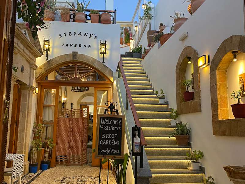 Die Taverna Stephany's liegt mitten in den engen Altstadtgassen von Lindos und verfügt, wie dort viele Tavernen, über eine Dachterasse. Bereits der Eingangsbereich ist liebevoll gestaltet mit Blumen. Über eine steile Treppe kommt man auf der 1. Ebene an, wovon es weiter auf noch 2 Ebenen geht. Wir saßen ganz oben, mit Blick auf Akropolis von Lindos und konnten schön den Sonnenuntergang erleben. Die Aussicht von oben war herrlich, auf ein Gewirr weiterer gepflegter und schön eingedeckter Terassen. Das Essen war lecker, schön angerichtet und....NICHT überteuert. Im Gegenteil, bei uns im Hotel (Kresten Palace Kalithea) kostet 0,25 Cola 2,60 € hier nur 1,80. Ich hatte einen gemischten griechischen Teller für 12,-- mit Mousaka, Dolmades, Zaziki, gefüllter Tomate.....LECKER. Bedienung freundlich und flott, allerdings war Ende Mai relativ wenig los, nicht nur in diesem Lokal sondern generell abends in Lindos.