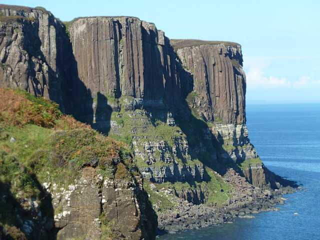Im Norden der Isle of Skye, nahe dem Ort Staffin, fallen steile Klippen gut 90 m tief ins türkisgrüne Meer. Man nennt sie den "Kilt Rock", weil sie wie die Falten eines schottischen Kilts aussehen. Dieses Phänomen wurde durch vulkanische Aktivität hervorgerufen: Flüssige Lava drang durch Spalten des darüber liegenden Sandsteins nach oben und bildete so die senkrechten Gesteinsformen. Vom Parkplatz aus sind es nur wenige Meter bis zum steilen Klippenrand, von wo aus man bei gutem Wetter einen herrlichen Blick auf den sprühenden Mealt-Wasserfall und den dahinter aufragenden Kilt Rock hat. Ein Blick nach rechts lohnt sich ebenfalls, wenn er auch nicht ganz so spektakulär ist. Das war´s dann auch schon. Doch wenn man der Reklame auf dem Parkplatz folgt, lohnt sich wahrscheinlich die 1,5 Meilen Weiterfahrt nach Staffin (in der Wikingersprache "Platz der Säulen", also der Kilt Felsen), denn hier soll es einige Fußabdrücke verschiedener Dinosaurier geben. Wir hatten auf unserer Rundfahrt leider keine Zeit für einen Besuch..