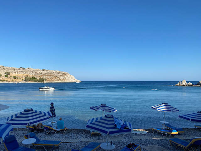 Schöner, wenn man möchte, einsamer Strand. Nur am Anfang, direkt unterhalb des kleinen Parkplatzes stehen etwa 20 Schirme mit je 2 Liegen zu 8€/Tag. Danach in Richtung Lindos ist schätzungsweise 2 km Kiesstrand absolu frei und verlassen. Wie an einsamen Stränden in Griechenland üblich, kann aber etwasWohlstansmüll rumliegen.