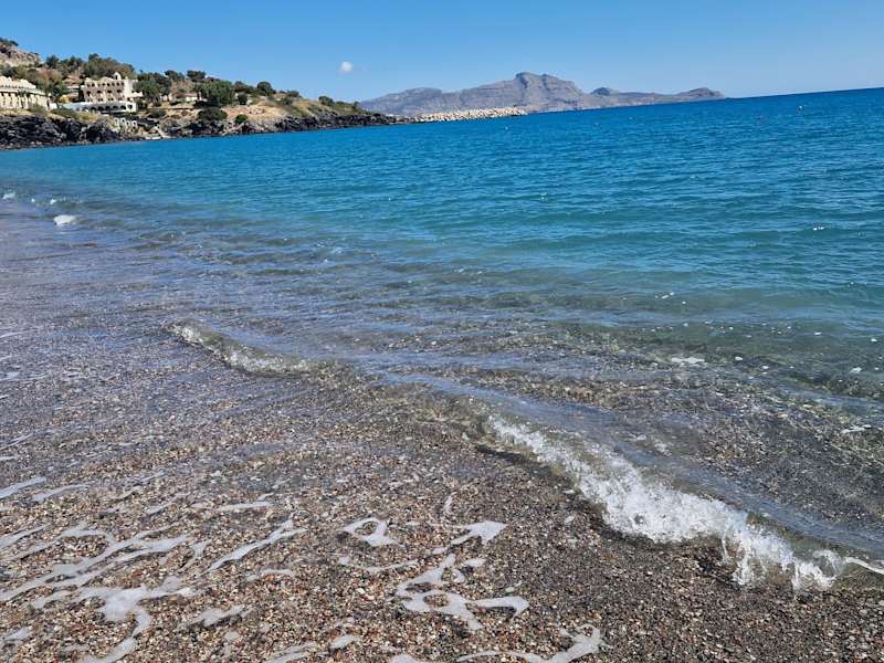 Dieser tolle Strand bei Kalathos ist wirklich sehenswert. Runder Kiesel der nicht sticht, aber sehr tief ist und deshalb teilweise schwer zu gehen. Es herrschte hier absolute Ruhe, nur ca. 10 Personen waren weit verstreut anwesend und dass Mitte Juni. Der Strand ist zig Kilometer lang. Liegen u. Schirme sind vorhanden. Die einzige Strandbar (ein wenig desolater Zustand) war leider vormittags verschlossen. ca. 150 Meter weiter befindet sich ein schönes 5* Hotel. (auch mit tollen Appartments mit Garten) Tolle Anlage.