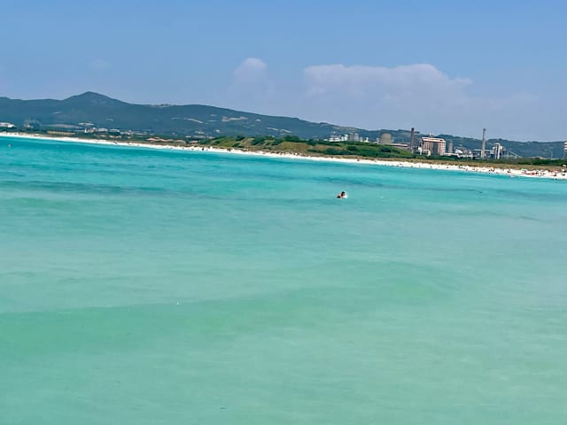 Der Strand ist wunderschön, aber die tolle weisse Farbe stammt vom nahen Industriekomplex, der jahrzehntelang Schwermetalle, u. a. Quecksilber ins Meer einleitet. Unklar, was heute noch eingeleitet wird, Verbotsschilder nur in der Nähe des Abflusses. Ab Mittag je nach Wind dann zusätzlich Plastikmüll im Wasser. Sand voller Unrat, u. a. Zigaretten. Zum Anschauen von weitem ok. In der Strandbar gibt es sehr günstigen Junkfood mit viel Plastikmüll.
