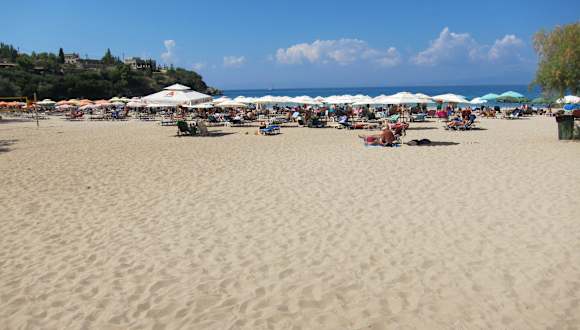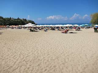 Flachabfallendes, schöner Strand (Badebucht). Für Kinder ideal. Es gibt Duschen, Liegen und Schirme (im Oktober kostenfrei). Strand ist fein- bis grobsandig. Es gibt eine Strandpromenade mit Cafés, Tavernen, Supermärkten und kleinen Souvenirläden. Strahlt im Oktober eine schöne Ruhe aus. Im August sicherlich sehr heiss und voll?!