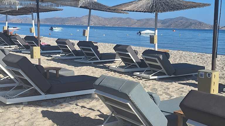 Wenn Tigaki-Beach, dann unbedingt zum "SeaSide Tigaki" von Panos! Die Betten sind groß und bequem, die Schirme sind einmalig: 45 ° neigbar und 360 ° drehbar außerdem mit Safe und USB-Ladegerät (kl. Aufpreis) freies WLAN Umkleidekabine Dusche Speisen- und Getränke-Service (mittels QR-Code am Tisch) vom naheliegenden ROOSTER-Restaurant, wo man auch das WC benutzen darf
