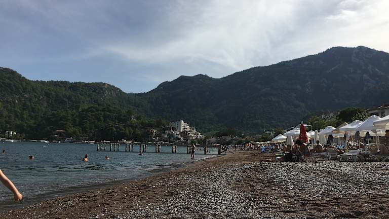 Die Bucht von Turunc ist recht klein. Die beiden großen Hotels beanspruchen Teile des Strandes für sich, man wird sogar beim "Turunc-Resort" von Wachleuten am Weitergehen gehindert, obwohl angeblich alle Strände öffentlich sind. Der restliche Strand ist sehr schmal und größtenteils mit Liegen bestückt. Diese gehören zu den angrenzenden Restaurants. Wenn man dort etwas konsumiert, kann man die Liegen kostenlos nutzen. Da reichen auch Getränke ... Das Wasser ist meist klar, nur bei ungünstiger Strömung kommen Müllreste vom Meer herein. Wir haben auch 2 Tage mit Sturm erlebt, da war gar kein Strand mehr vorhanden (September 2015).
