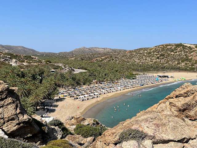 Ergänzung und Korrektur zur vorheriger Aussage: Die Liegen in Galini samt Sonnenschirm kosten nicht 2 €, sondern 3 €/Person. Bei der Abzweigung zum Strand in Vai war ein Obst-/Gemüsestand, bei dem wir hervorragende Bananen und Feigen kauften zu einem sehr fairen Preis.