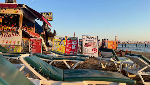 Bei Ismet ist es wunderschön, man sitzt Abends direkt am Strand, zwei Meter neben den Wellen. Gute Musik und zwei mal in der Woche macht er sogar eine Schaumparty. Befindet sich neben dem Hotel Thalia Beach.