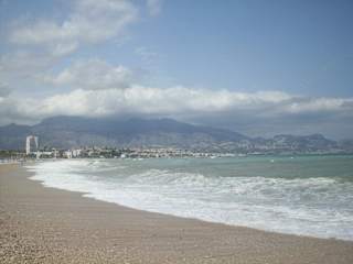 Schöner weißer langer Kiesstrand. Schnell teilweise "steil" abfallend und Meer schnell tief. Kies größtenteils sehr grob (unangenehme Wacken bis zu 5 cm Durchmesser). Machte mir barfuss nicht besonders Spaß. Badeschuhe sehr wichtig. Für kleine Kinder nicht so toll. Ein eigener Sonnenschirm kann wohl kaum in den Boden gedrückt werden. Für uns Sandstrandgewohnte Meerbader war es kein Vergnügen. Wir sind dann öfters nach Calpe gefahren. Kleiner Vorteil: Es gibt keine sandigen Füße und die Füße werden gut massiert (naja).