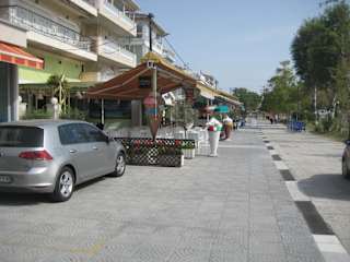 Olympic Beach / Olympiaki Akti hat eine hübsche kleine Strandpromenade. Von Paralía aus kommend geht man zuerst an einer Art Gedenkkapelle vorbei, die zum Strand hin liegt. Wenige Meter weiter verläuft die Promenade dann entlang eines netten kleinen Parks, danach gelangt man in den Promenadenbereich mit Cafés und Restaurants. Dieser Teil der Promenade ist wirklich hübsch und ansprechend gestaltet: Alles ist blau, weiß und gelb gehalten, sehr proper :-) - mit einem schönen Blick auf den Strand. Ich habe dem Städtchen und der Promenade gegen 10 Uhr morgens einen Besuch abgestattet. Zu dieser Zeit waren natürlich noch nicht so viele Urlauber unterwegs, so dass ich mir die Cafés, usw. entlang der Promenade in Ruhe anschauen konnte. Und mein Fazit: Es hat mir sehr gut gefallen. Die Strandpromenade von Olympic Beach (und übrigens auch das Örtchen an sich) lohnt einen Besuch. Ich fand die Gestaltung – insbesondere im Vergleich zu Paralía – gelungen, schön. Aber das ist natürlich Geschmackssache.