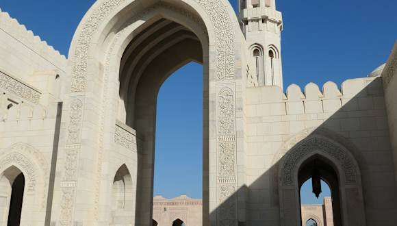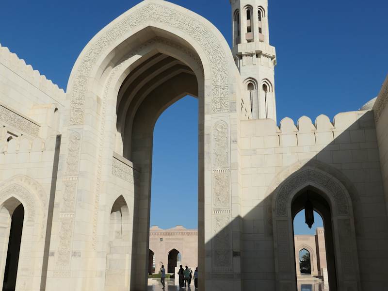 Die große "Sultan-Qaboos"-Moscheein Maskat ist die Hauptmoschee im Oman und die größte des Landes. Das ca. 4 ha große, sehr schön begrünte Gelände enthält die große Männergebetshalle (für ca. 7000 Gläubige), eine kleinere Frauengebetshalle (für ca. 700 Gläubige), fünf Minarette (bis zu 92 m hoch), zwei große Bogengängen ("Riwaqs"), ein islamisches Informationszentrum sowie eine Bibliothek. Die Männergebetshalle ist 75x75 m groß und enthält einen der größten handgeknüpften Teppiche der Welt (ca. 1,7 Milliarden Knoten auf knapp 4200 m²) sowie einen der größten Lüster der Welt (ca. 8 x 14 m, mit über 1000 Svarovsky-Edelsteinen). Die Anlage kann vormittags von Nicht-Muslimen besichtigt werden. Ganz wichtig ist - vor allem für Frauen - die Einhaltung der Kleiderordnung, auf die mit Schildern hingewiesen wird! Hierzu zählen: keine kurzen Hosen oder kurzärmelige Hemden und Frauen müssen Tüchertragen, die das Haar komplett bedecken. Dies wird am Eingang streng kontrolliert. Tücher können dort aber ggf. ausgeliegen werden!