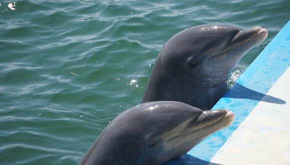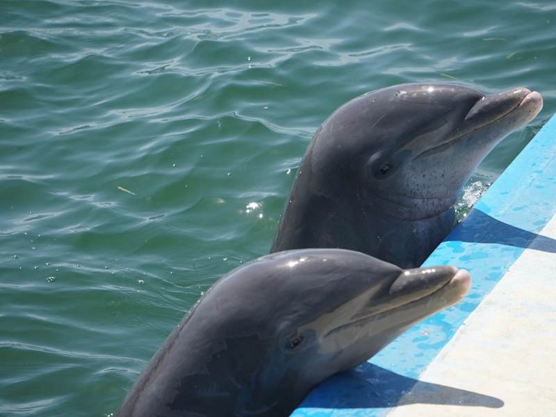 Mit dem Bus gings vom Hotel zu Marina Gaviota. Von dort mit einem Katamaran, der bis zu 80 Leute trägt zu den Delfinbecken vor der Küste. Hier steht man bis zum Bauch im Wasser und kann die Delfine, die an der Reihe vorbeischwimmen streicheln und sich küssen lassen. Je nach trainer kann man auch eine Runde mit Ihnen schwimmen oder Kunststücke machen. Von dort geht es normalerweise noch zu einer Insel zum Lobsteressen am Strand und zum Schnorcheln am Riff. Dies konnten wir wegen des Wetters leider nicht, so dass der Ausflug mit Lobster im Hafenrestaurant endete. Wir fanden 75,-CUC, bzw. für uns 65,- nicht zuviel, für einen, bzw. halben Tag auf dem Wasser mit Essen (auf dem Katamaran gabs noch Sandwichs), Trinken und Delfinschwimmen.