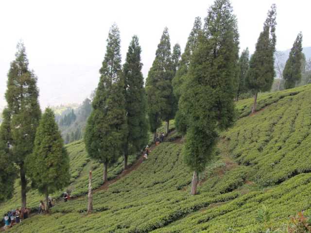Wir legten bei unserer Fahrt nach Rangpo/Sikkim einen Photostopp bei einer Teeplantage in der Nähe von Lamahatta ein. Bei dieser Kurzpause besichtigten wir auch die herrlich gelegene Teeplantage. Der Ort Lamahatta ist laut Internet etwa 23 km von Darjeeling entfernt. In der Nähe von der Ortschaft Lamahatta befindet sich auch der berühmte Fluss Teesta. Bis zur Hüfte standen die Teepflückerinnen in farbigen Baumwollsaris zwischen Teebüschen in sattem Grün. Sorgsam gezupfte Blätter wurden in die auf Rücken gebundenen Flechtkörbe geworfen. Ein Bilderbuchmotiv für uns Photographen. Wie uns ein Einheimischer erzählte, sollten Teepflückerinnen in Westbengalen fest angestellt sein, aber sie sind oftmals auf Tagesbasis beschäftigt. Wenn sie arbeiten, werden sie bezahlt, wenn sie nicht arbeiten, gibt es keinen Lohn. Trotz dieser Missstände sahen wir überwiegend nur lächelnde Arbeiterinnen.