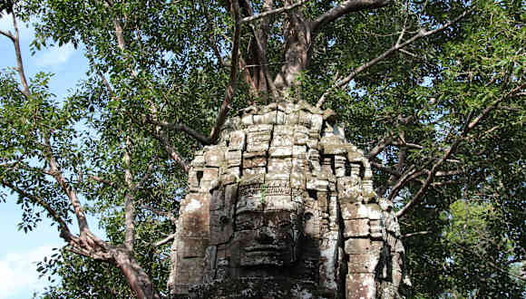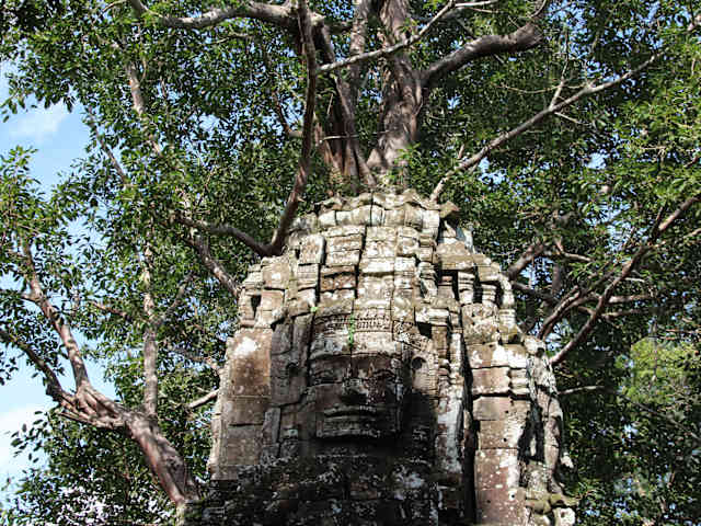 Dieser eher kleine unrestaurierte Tempel liegt etwas abgelegen nordwestlich von den großen Tempeln. Er wurde von den Archäologen als eine Miniaturversion des Ta Prohm eingestuft. Der Tempel wurde von dem König für seinen Lehrer und Mentor gebaut. Beeindruckend ist an diesem Tempel die hier herrschende Dschungelatmospäre. Da bei unserem Besuch kaum Touristen da waren und wir quasi alleine in den teilweise mit Vegetation überwucherten Ruinen herumkletterten, hatte ich manchmal den Eindruck mich in einer irealen bizarren Welt von Schatten und Licht zu bewegen ein Zauber dem man sich kaum entziehen kann, der aber schnell verfliegt wenn man sich dem Ausgang nähert und die Kinderverkäufer sich mal wieder auf einen stürzen. Beeindruckend sind auch die Gesichtstürme am Eingang und Ausgang dse Tempels vor allem der ösliche Gesichtsturm (Gopuram) mit der Würgefeige.