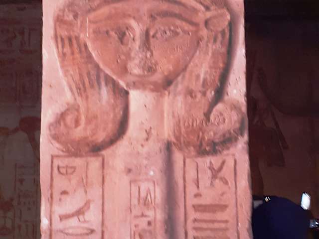 Neben dem monumentalen Tempel für Ramses II. steht der etwas kleinere Tempel für seine Lieblingsfrau Nefertari. An der Fassade des Tempel gibt es mehrere Statuen von Nefertati als Hathor mit ihren Kuhhörnern und der Sonnenscheibe und von Ramses II. mit unterschiedlichen Kronen. Das Innere des Tempels ist deutlich kleiner als in dem benachbarten Tempel des Ramses, aber es gibt auch hier einige schöne Reliefs und Wandmalereien.