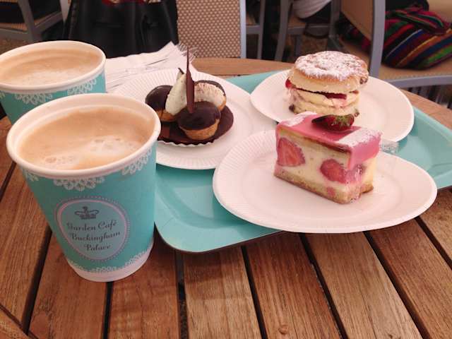 Wenn die Queen über die Sommermonate auf dem schottischen Gut Balmoral weilt, wird der Buckingham Palace für die Besucher geöffnet. Nach einem Rundgang durch die Staatsräume des Palastes (Eintritt kostet etwas über 20 Pfund) hat man abschließend die Möglichkeit, eine königliche Kaffee- oder Teestunde im Garden Café auf der Westterrasse, mit fantastischem Blick über die royale Gartenanlage, abzuhalten. Wir haben nach dem Besuch des Palastes hier sehr feine und unglaublich leckere Erdbeer-Sahne/Marzipan-Törtchen gegessen. Die Preise sind zwar etwas gehobener aber die Qualität spricht eindeutig für sich. Sehr empfehlenswertes Café - hier sollte man wirklich unbedingt am Ende einer Führung noch vorbeischauen, da es in meinen Augen ein besonderes Erlebnis darstellt, diese wunderbare Köstlichkeiten in der offiziellen Residenz der Queen genießen zu können.