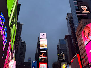 Wer New York besucht, besucht auch den Times Square, den Kreuzungsbereich des Broadways mit der 7th Avenue. Hier sind das Hard Rock Cafe, viele Restaurants, Hotels, Geschäfte und riesige Werbetafeln. Aktuelle Börsenkurse und Nachrichten laufen über riesige Anzeigetafeln. Hier zählt die leuchtende Kugel Silvester den Countdown und viele Musicals werden in der Umgebung aufgeführt. Tag und Nacht wimmelt es hier von Besuchern und abends zusätzlich von Straßenkünstlern wie Akrobaten, The naked Cowboy/Cowgirl, Mickey Mouse usw. Aber auch die Polizei ist sehr präsent: zu Fuß, mit Auto oder Motorrad oder zu Pferd. Vor allem abends muss man das Treiben am Times Square erlebt haben!!!