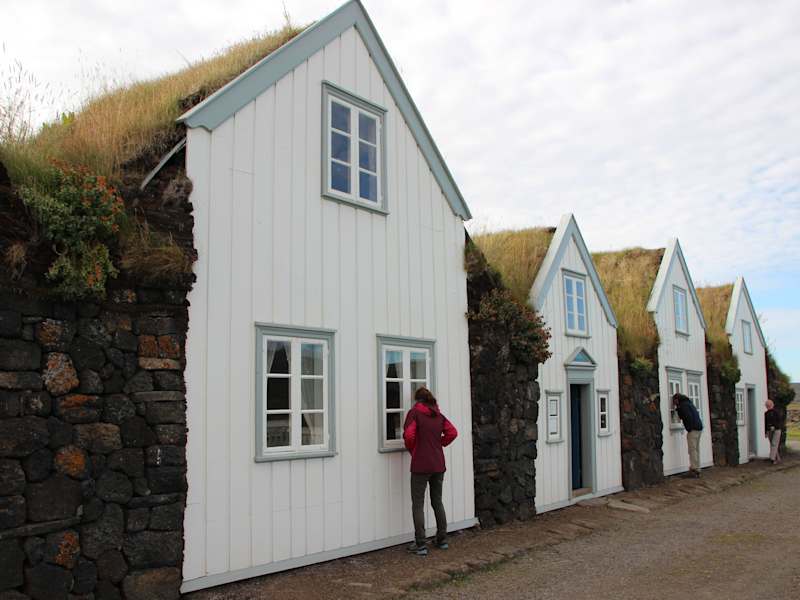 Die ältesten Teile dieser Torfhaussiedlung stammen von ca. 1865. Es sind schon ein paar etwas komfortablere Behausungen dabei. Bewohnt waren die Häuser bis 1949. Später wurden die Häuser renoviert und 1958 als Freilichtmuseum eröffnet. Fast alle Räume können besichtigt werden. einige "Wohnungen" sind auch zweistöckig als Wohnräume ausgebaut. Am Ende der Besichtigung gibt es noch eine Einladung zu einer Tasse Kaffee oder Tee im angrenzenden Besucherzentrum in dem auch per Videopräsentation noch einige Informationen abzurufen sind. Zu finden ist diese Siedlung wenn man von der Ringstraße N1 auf der Straße Nr.845 Richtung Husavik fährt und dann nach etwa 14 km auf die Hinweisschilder achtet.
