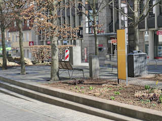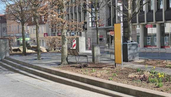 Die Verkehrsinsel in der Straße Jägerbrunnen, die erst 2008 errichtet wurde, ist nicht einfach eine Verkehrsinsel, sondern sie ist eine „Mini-Parkanlage“ mit kleiner Grünfläche, einigen Sitzmöglichkeiten, dazu kommt ein kleiner Felsgarten und ein Brunnen, der als Wasserlauf über / durch den Felsgarten plätschert. Da durch die Straße inzwischen wesentlich weniger Verkehr fließt als vor der Umgestaltung, kann man hier durchaus auch eine kleine Pause einlegen.