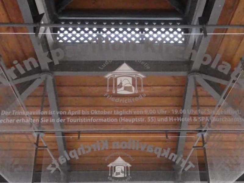 Zwischen der Marktstraße und der Kirchgasse in Friedrichroda befindet sich auf dem Kirchplatz der „Trinkpavillon Kirchplatz“. Hier läuft aus vier Rohren das Wasser der Ludowinger-Quelle. Man kann direkt am Pavillon das Wasser aus der Ludowinger-Heilquelle trinken - oder ggf. auch in eine mitgebrachte Flasche abfüllen. Der Trinkpavillon Kirchplatz ist zudem aber auch recht nett zum Anschauen. Die Ludowinger-Quelle ist eine recht neue Heilquelle (sie wurde erst 1995 „gebohrt“, 1997 in Betrieb genommen und 2001 als Heilquelle ausgewiesen). Die eigentliche Quelle ist in einer Tiefe von 58 Metern und befindet sich im Schlosspark Reinhardsbrunn. Laut Beschriftung ist Trinkpavillon Kirchplatz von April bis Oktober täglich von 09:00 – 19:00 geöffnet (Stand Sept. 2020).