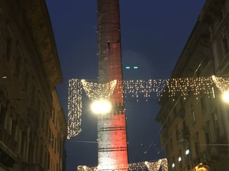 Zum historischem Hintergrund, sowie zur Besteigung wurden hier ja schon ausführliche Tipps abgegeben. Mein Tipp gilt der Vorweihnachtszeit in Bologna. Am Samstag vor dem 1. Advent findet so zwischen 18 und 19 Uhr eine feierliche "illuminaizone natalizia" statt. Das heißt, dass diese beiden Türme für die Adventzeit bis zum 6. Januar in den Abendstunden in vielen Farben angeleuchtet werden. Man sollte sich schon zeitig einen Stehplatz dort ordern, denn die Nachfrage ist groß, und viele Menschen sind bei diesem Spektakel dabei.