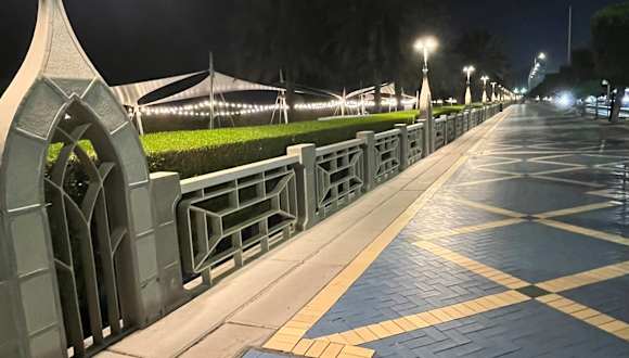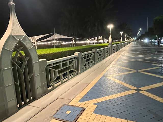 Die Corniche ist die Schauseite Abu Dhabis. ca. 9 km lang. Hier gibt es viel Grün und unzählige Erholungsbereiche für die Bevölkerung und wunderschöne, fantastisch ausgestattete Spielplätze, sowie eine vielzahl von zum Teil beschatteter Bänke, Ruhebereiche und viel Wasser. Aber auch viele grosse Parkplatzanlagen. Hat man die vielbefahrene mehrspurige Uferstrasse gefahrlos unterquert ,hier stehen mehrere moderne Unterführungen zur verfügung, erreicht man die wunderschöne grosszügig gestaltete Uferpromenade ,die wie erwähnt ca. 9 km direkt am Persischen Golf entlang verläuft, ebenso wie ein extra angelegter Fahrradweg und mehrere Strandabschnitte. Unser Tipp: Unbedingt besuchen !