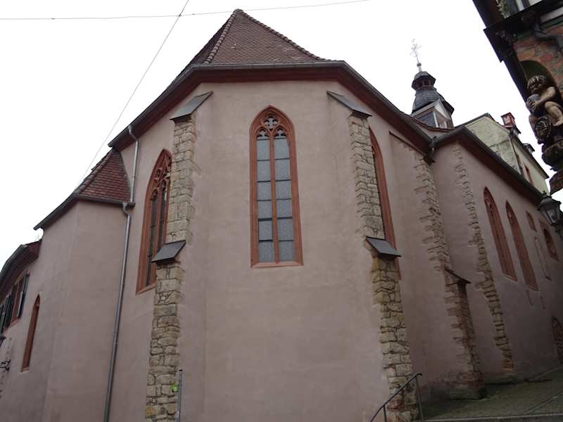 Am Marktplatz ist das Hauptportal der Ulner Kapelle von einem Wohnhaus überbaut. Die Kapelle wurde Mitte des 14, Jahrhunderts erbaut - an die Kapelle wurde das frühere Armen- und Altenspital angebaut. Wer sich an der Seite der Kapelle in das Gerberbachviertel begibt kann von dieser Seite den Chor und das Langhaus der Kapelle sehr gut sehen. Die Kapelle war bei unserem Besuch in Weinheim geschlossen und scheint allgemein für Veranstaltungen buchbar zu sein.