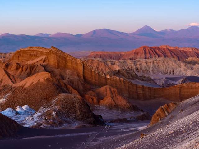 Das Valle de la Luna in San Pedro de Atacama im Norden Chiles ist eines der bekanntesten Täler der Welt. Man mietet sich ein Fahrrad oder gelangt mit einer Tour ins Innere des Tals des Mondes. Hier bestaunen tausende Menschen jeden Tag das Spektakel des Sonnenuntergangs. Inmitten der trockensten Wüste der Welt (Atacama Wüste) verwandeln sich der Sand, die Steine und die Felsen in ein farbliches Spektakel, welches einer Explosion ähnelt. Verfasst von HolidayCheck Das Valle de la Luna (Tal des Mondes) liegt etwa 17 Kilometer westlich von San Pedro de Atacama in der Cordillera de la Sal. In dem Tal hat sich über die Jahrtausende durch Vulkanismus, Erosion, große Temperaturunterschiede, die Sonneneinstrahlung und heftige Winde auf dem Boden eines ehemaligen Salzsees eine mondähnliche Landschaftsstruktur gebildet, die nur wenig Flora und Fauna aufweist. Sie besteht aus den unterschiedlichsten Formen, Zacken, Vertiefungen und Felsspitzen, darunter die Salzformation Las Tres Marías (Die drei Marien). Bei Sonnenuntergang und in Vollmondnächten erscheinen die Felsklippen in den unterschiedlichsten Farben von rosa über lila bis hin zu blauen und grünen Nuancen.