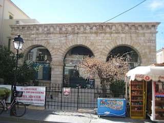 Die Venezianische Loggia befindet sich im Zentrum der Altstadt – an der Kreuzung der Straßen Arkadiou / Paleologou - Petichaki. Sie geht ein wenig unter in diesem schon sehr quirligen Shoppingbereich und war zur Zeit meines Besuches in der Straße Arkadiou ein wenig von Büdchen, Schildern, usw. verdeckt. Laut Anschlagtafel vor Ort wurde die Loggia im späten 16. Jh. erbaut und diente der venezianischen Adelsschicht als Versammlungshaus. Weiterhin waren dort diverse öffentliche Verwaltungen untergebracht und ab und an wurde sogar Korn in der einen oder anderen Räumlichkeit gespeichert. 1657 dann wurde die Loggia – unter türkischer Herrschaft – in eine Moschee umgewandelt und an der nordwestlichen Seite wurde ein Minarett erbaut. Dieses Minarett ist auf einem alten Foto (Ausstellungstafel vor der Loggia) deutlich zu erkennen. In den 80er Jahren des 20. Jh. war das Archäologische Museum von Rethymnon in der Loggia untergebracht. Heute findet man dort einen Ausstellungsraum mit diversen Nachbildungen / Kopien - Statuen, Schmuck, usw. - , die käuflich zu erwerben sind. Das Gebäude an sich wurde sehr schön und dem ursprünglichen Gebäude entsprechend restauriert. Kleiner Unterschied: Die früheren offenen Tor- / Rundbögen sind heute verglast - in der Straße Paleologou das frühere Eingangstor (mittlerer Rundbogen) und die beiden früher offenen Fenster rechts und links des Eingangstors.