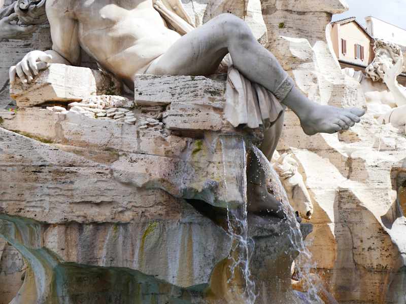 Der Vierströmebrunnen ist ein Meisterwerk von Bernini. Der Bau wurde in der Barockzeit von 1647 bis 1651 ausgeführt. Bernini wollte den Mitbewerber Borromini ausstechen, um die Gunst des Papstes Innozenz X. zu erringen. Dieser Papst gehörte der Familie der Pamphili an, von deren Reichtum ich jetzt schon viel gehört habe. Auch der Palast gegenüber dem Mohrenbrunnen gehörte dieser Familie. Heute ist in diesem Palast der Sitz der brasilianischen Botschaft. Aber zurück zum Brunnen, die damals bekannten Erdteile wie Afrika, natürlich Europa, Südamerika und Indien. Deshalb setzte man auf diesen Brunnen jeweils eine Figur die z. B. die Donau, Afrika mit dem Nil, Südamerika mit dem Rio de la Plata und der Ganges für Indien. Die Quelle des Nils war damals nicht bekannt, so hat man dieser Figur den Kopf verhüllt. Der Brunnen strahlt in Marmor, völlig weiß um die Wette mit den anderen Brunnen.