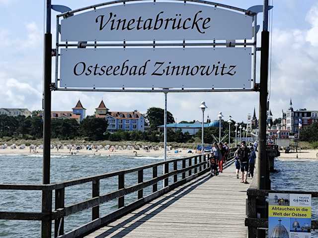 Die heutige Vinetabrücke, die Seebrücke von Zinnowitz, ist 315 Meter lang. Die Brücke hat eine wechselvolle Geschichte. Ein erster Ostseesteg wurde 1897 errichtet, damit Besucher mit dem Schiff anlanden konnten. Eine echte Seebrücke wurde 1908 errichtet. Bedingt durch Sturmschäden und starker Verwitterung musste diese nach 1945 abgerissen werden. 1993 wurde dann die neue, heute vorhandene Seebrücke fertiggestellt und sie trägt den Namen "Vinetabrücke", benannt nach der sagenumwobenen Stadt Vineta, die nach Überlieferungen vor langer Zeit in der Ostsee versank. 2006 wurde am Ende der Brücke eine Tauchgondel angebaut, mit der man in die Ostsee abtauchen kann. Von der Seebrücke aus hat man schöne Ausblicke. Abends kann man mit etwas Glück fantastische Sonnenuntergänge erleben.
