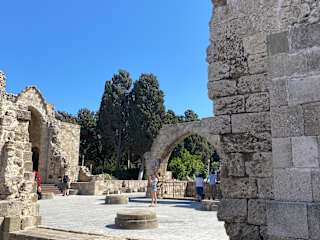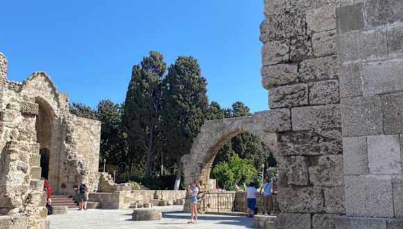 In der Nähe der Ruinen der Kirche Jungfrau Maria an der Pindarou Straße ist hier ein Tor zum Touristikhafen. Dieses Stadttor wurde erst im Jahr 1955 durch die Stadtmauer gebrochen, damit man schnell auch mit den Autos aus dem südlichen Stadtquartier zum Hafen gelangt. Das Tor ist ein echter Hingucker, ein Fotomotiv von bester Güte. Das Tor ist mit einer Ampelanlage bestückt, denn hinter der Stadtmauer ist ein reger Verkehr, mit Autos die zu den großen Schiffen fahren.