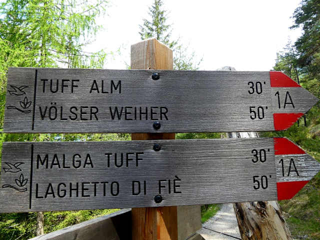 Wir parkten am ausgewiesenen Parkplatz am Völser Weiher. Es gibt direkt fantastische Ausblicke auf den Völser Weiher, es ist im Sommer auch ein Badesse. Wir verließen den Weiher und wanderten nach der Ausschilderung und der Wander- App in Richtung Tuff Alm hoch auf 1270 m. Es gab immer wieder schöne Ausblicke aber auch einige knackige Anstiege. Wir liefen bis zur Tuff Alm. Bis dahin gingen wir recht abwechslungsreich ca 50 Minuten. Hier machten wir bei Apfelsaft und Kaffee mit traumhafter Aussicht auf den Schlern eine Pause. Nach einer Zeit wanderten wir weiter zum eigentlichen Ziel der Hofer Alpl auf 1364 m. Es ging gleich noch mal etwas nach oben auf einem Weg der mit Trittsicherheit ausgeschildert war. Es war ein wirklich schöner Weg dorthin. Auch für Kinder wird hier viel geboten, es gibt einen schönen Spielplatz, es gibt Tiere im Streichelzoobereich und viel Auslauf. Hier gab es auf d er Terrasse ein Radler und ein Weizenbier dazu Spaghetti mit frischen Tomaten, gehobeltem (Bergkamen) Bergkäse und Bergkräuterolivenöl. Mein Mann entschied sich für Spinat und Käseknödel auf Krautsalat und dazu gab es einen kleinen gemischten Salat. Anschließend bestellte ich mir einen Espresso und mit der Rechnung von 33 Euro gab es noch zwei Schnapserl vom Haus. Es war alles wirklich so lecker. Danach machten wir uns auf den weiteren Weg. Nach 11 km und ziemlich genau 400 Höhenmetern waren wieder am Parkplatz. Unterwegs haben wir kaum Wanderer gesehen. 4 MTB kamen uns mit den Rädern entgegen. Es waren wirklich wenig Menschen unterwegs und auch auf dem Parkplatz standen gerade mal 10 Autos. In der Saison werden für den Parkplatz 6 Euro Tagesgebühr fällig. Jetzt war noch alles geschlossen.