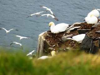 Cape St. Mary’s an der südwestlichen Spitze von Avalon/Neufundland ist ein atemberaubend ursprünglicher, wildschöner Ort, der allein der Natur zu gehören scheint. Von drei Seiten vom Atlantik umtost, erstreckt sich Tundralandschaft mit ihrer zähen, genügsamen Pflanzendecke unter ständigem Wind. Umso erstaunlicher ist es, dass das Gebäude des großen Interpretive Centers hier überhaupt nicht stört, sondern irgendwie ‚dazugehört‘ wie die Schafe, die hier weiden – und natürlich die Vögel. Denn die Klippen in der Bord Rock Cove von Cape St. Mary’s, ganz besonders der Bird Rock (Vogelfelsen) selbst gehören seit undenklichen Zeiten den Seevögeln. Auch Weißkopfseeadler, große Raben und Krähen streifen über das Land. Aber der Anblick der Basstölpel, die wie ein wirbelnder Schneesturm den Bird Rock umschweben, ihn dicht an dicht wie mit einer weißen Decke überziehen, lässt alle Besucher staunen. Vom Interpretive Center mit seiner sehr guten Ausstellung zu den Vögeln hier führt ein gut gangbarer, gut gekennzeichneter Weg die Klippen entlang zu einem Felsplateau, von dem aus man einen unvergleichlichen Blick auf den nahen Vogelfelsen hat, eingehüllt in das helle Flattern und Rufen heimkehrender oder abfliegender Basstölpel. Ringsum in den Felsen – auf winzigen Vorsprüngen und kaum handbreiten Überhängen, in engen Spalten und Absätzen, nisten andere Seevögel: Trottellummen und Papageientaucher, Kormorane und Ohrenscharben, Dickschnabellummen und Gryllteiste – und natürlich die zierlichen, pfeilschnellen Dreizehenmöwen. Für jeden Naturfreund und Vogelliebhaber ist ein Besuch auf Cape St. Mary’s kein Muss, sondern ein unbedingtes ‚Will‘! Und wer im Juli kommt, kann mit ein bisschen Glück auch auf Buckelwale, Finnwale und Minkwale hoffen, die sich im fischreichen Atlantik direkt vor den Klippen sattfressen. Wichtig: gute wetterfeste Outdoor-Kleidung (es ist auch bei gutem Wetter sehr windig dort), richtige Wanderschuhe (das ist kein Weg für Slipper oder Sandalen!), möglichst auch ein Fernglas – und den Fotoapparat nicht vergessen! Die in Neufundland allgegenwärtige Mückenplage ist hier - natürlich - wesentlich geringer! Der Vogelfelsen ist von Mai bis Oktober zugänglich, ebenso das Interpretive Center.