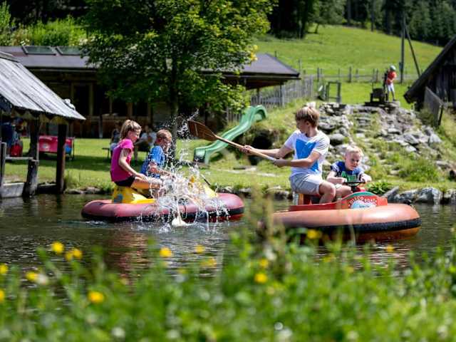 Die Waldhäuslalm ist Ausgangspunkt für eine Vielzahl von Wanderungen, je nach Zeit, Lust und Laune. Für Einsteiger eignet sich zum Beispiel ein Spaziergang zum Riesach-Wasserfall, der höchste Wasserfall der Steiermark, der sich über 140 Meter hohe Kaskaden in die Tiefe stürzt. Ein breiter Steig führt entlang des Wasserfalls zu einer Brücke, von der aus man das imposante Naturschauspiel beobachten kann. Besonders beeindruckend ist der Wasserfall im Frühling zur Zeit der Schneeschmelze. Die Waldhäuslalm liegt am Themenweg Wilde Wasser, am Talboden entlang (kinderwagengerecht) erreicht man in ca. 1 Stunde den Parkplatz Riesachfall In der Waldhäuslalm sollen sich nicht nur große, sondern auch kleine Gäste wohl fühlen: Der Abenteuerspielplatz neben dem Gasthaus lässt keine Wünsche offen. Für kleine Tierfreunde gibt es einen eigenen Stall und auch die Kinder dürfen im großen Teich fischen. Jeden Dienstagnachmittag im Sommer gibt es ein eigenes Kinderprogramm Bei so viel gebotener Action können die Eltern in der Zwischenzeit das Privileg nutzen, beruhigt und in Ruhe von der Terrasse aus ihrem Nachwuchs zuzuschauen