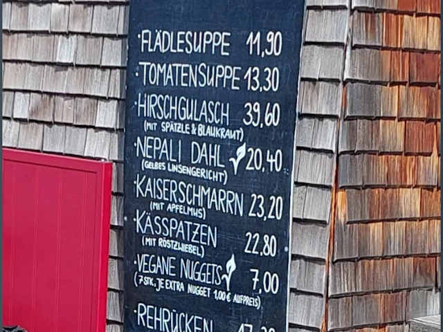 Zur Ostlerhütte geht es ab der Bergstation der Hochalpbahn ca. 30 Minuten steil bergauf. Wer nicht bereit ist, für die Einkehr ein Vermögen auszugeben, der sollte nach einem kurzen Aufenthalt am Gipfel den Rückweg antreten und eins der Lokale an der Breitenbergbahn besuchen. Man könnte meinen, der Breitenberg befindet sich in der Schweiz. Ich lade ein Foto der Tageskarte mit hoch. Am Nebentisch wurde ein Kaiserschmarrn mit vier (!!) Gabeln bestellt. Ok bei dem um 23.20 Euro stand auch dabei 'zum Teilen'. Die Getränkepreise sind ebenfalls abgehoben. Der Kaiserschmarrn sieht zwar schön aus und war auch lecker (obwohl schätzungsweise nicht selbstgemacht), aber braucht man ernsthaft im April auf einer Berghütte Erdbeeren und eine Himbeere (zum teilen)? 🤔 Mir ist durchaus bewusst, dass Lebensmittel teurer geworden sind und dass sie auch irgendwie auf den Berg transportiert werden müssen. Aber dazu steht ja ein großes Auto vor der Hütte. Mir persönlich hat ein einmaliger Besuch der Ostlerhütte gereicht.