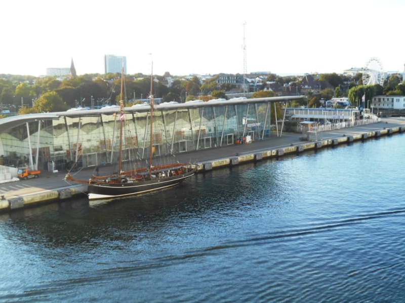 Das Terminalgebäude ist eine Stahl-Glas-Konstruktion und modern gestaltet. Hier kann man unkompliziert seine Seereise nach Norwegen oder in die Ostsee starten. Die große Halle hat je sieben Ein- und Ausgänge land- und seeseitig. Ist aber kein Vergleich mit dem großen Terminal in Savona. Zumeist erfolgt der Check In gegen 12-13Uhr je nach Rederei. Das Gepäck kann rechts neben dem Terminal beim zuständigen Personal abgegeben werden und wird auf die Kabine gebracht.