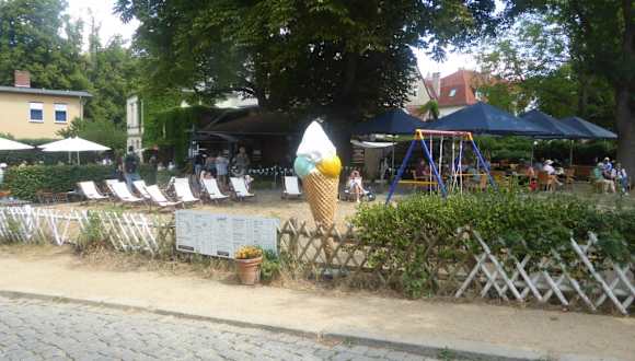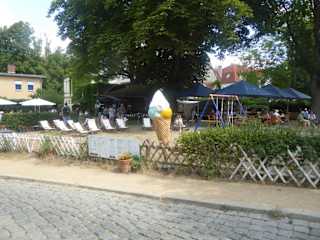 Nach unserem Spaziergang im Schlosspark von Babelsberg machten wir unsere Mittagspause im Café Wartmanns in Klein Glienicke. Das Café und Restaurant hat einen schönen Außenbereich mit Selbstbedienung. Der große und gemütliche Biergarten vom Café Wartmanns ist in der Waldmüllerstraße und nur einige Minuten vom Park Babelsberg entfernt. Trotz des sonnigen Tages gab es noch viele freie Plätze im Biergarten. Wir hatten Glück und fanden auch noch einen schattigen Platz unter einem Kastanienbaum in der Nähe der Essensausgabe. Wie man auf einer großen weißen Tafel am Eingang zum Café Wartmanns lesen konnte, gab es hausgemachten Kuchen, Eis aus eigener Herstellung, herzhafte Speisen und frisch gezapftes Bier. Das Eisangebot vom Café Wartmanns umfasst insgesamt mehr als 40 Sorten, wovon ein Teil täglich wechselnd präsentiert wird. Nebenbei erwähnt Fürst Pückler, Mitgestalter des nahe gelegenen Parks war ein ausgesprochener Eisliebhaber. Fürst Pückler war seit einem Galadinner im Sultanspalast von Konstantinopel ein leidenschaftlicher Eisliebhaber. Der Lausitzer Konditormeister Schulz widmete ihm das berühmte, später nach dem Fürsten benannte, Eis. Das Fürst-Pückler-Eis ist eine Eisspezialität aus drei verschiedenen Eissorten, welche gemeinsam gefroren werden Die Essen- und Getränkeausgabe waren von einander getrennt, d.h. man musste sich zweimal anstellen. Auf den Hinweistafeln waren die Speisen und die Getränke mit Preisangabe vermerkt. Es gab auch einen Wegweiser zu den verschiedenen Ständen. Die Bediensteten in beiden Verkaufsständen waren sehr freundlich. Ich habe mich für eine Bratwurst mit Semmel (4,00 Euro) und eine Halbe Bier (4,20 Euro) entschieden. Bei der Essensausgabe wartete ich etwa 10 Minuten und bei der Getränkeausgabe, gab es keine Wartezeit. Trotz Selbstbedienung kann ich den Biergarten vom Café Wartmanns in Klein Glienicke weiterempfehlen.