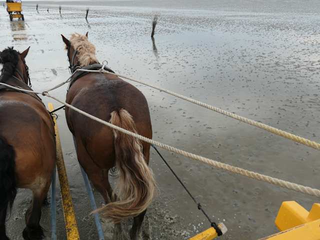 Die Pferdekutschenfahrt mit der Wattenpost von Duhnen nach Neuwerk (quer durch das Wattenmeer) und zurück war sehr schön. Für den ganzen Ausflug benötigt man insgesamt ca. 4 Std. (für Hinfahrt, Aufenthalt auf Neuwerk und Rückfahrt). Die Abfahrt in Duhnen ist beim “Haus Wattenpost” in der Duhner Strandstraße 19. Vor der Rückfahrt nach Duhnen hat man auf der Insel Neuwerk auch Zeit, damit man sich auf der Insel umschauen kann. So kann man z.B. zum Leuchtturm von Neuwerk gehen (und diesen besteigt, da man von oben einen schönen Ausblick hat), oder man kann auch zum Ringdeich gehen, der die Insel umgibt. Der Preis für die Kutschenfahrt von Duhnen zur Insel Neuwerk und zurück betrug im Mai 2024 EUR 50,-- pro Person (Kinder unter 10 Jahre EUR 25,--). Die Abfahrtzeiten sind tideabhängig und ändern sich dadurch täglich.