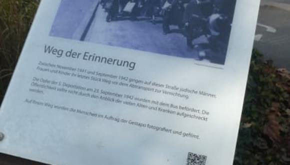 Der „Weg der Erinnerung“ in Würzburg erinnert an den Weg, den die jüdischen Mitmenschen aus Unterfranken auf ihrem Marsch zum „Verladebahnhof Aumühle“ in Würzburg zurücklegen mussten. Von diesem „Verladebahnhof Aumühle“ erfolgten die Deportationen der unterfränkischen jüdischen Mitmenschen in die Konzentrationslager und in die Vernichtungslager der NAZIs. Auf diesem Weg sind 5 INFO-Tafeln aufgestellt, die an diese Märsche erinnern.