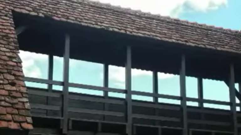 An der Ostseite der Zehntscheuer sind noch Teile des alten Wehrgangs zu sehen. Er ist der längste erhaltene, mittelalterliche Wehrgang in Altwürttemberg. Die Schießscharten und eine Pechnase waren für die Verteidigung wichtig. Adresse: Zehntgasse 11, 72280 Dornstetten Geodaten: FG82+VP Dornstetten
