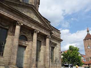 Beim Anblick des roten Sandsteins war ich zunächst verwundert, wie der Turm zu seinem Namen kam, aber das ließ sich dann leicht nachlesen: Er war früher weiß verputzt. Der Turm steht heute frei auf dem Ludwigplatz, war ursprünglich aber Bestandteil des Inneren Spittlertores und damit Teil der Stadtbefestigung und diente auch als Mautstelle.