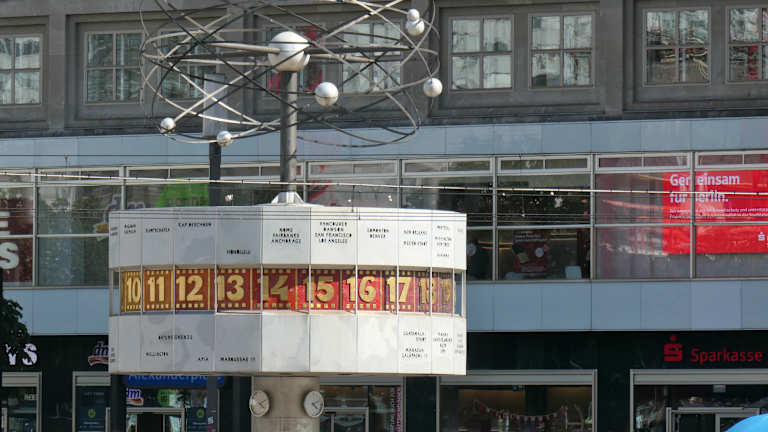 Wenn man beim Alexanderplatz ist, so sollte man sich auch einmal die Weltzeituhr aus dem Jahr 1969 anschauen, die zum 20-jährigen Bestehen der DDR errichtet wurde. Auf der Weltzeituhr kann man sowohl die aktuelle Ortszeit Berlin sehen, als auch die jeweilige Ortszeit in diversen Städten rund um die Welt. So gesehen ist die Weltzeituhr ein interessantes Objekt.