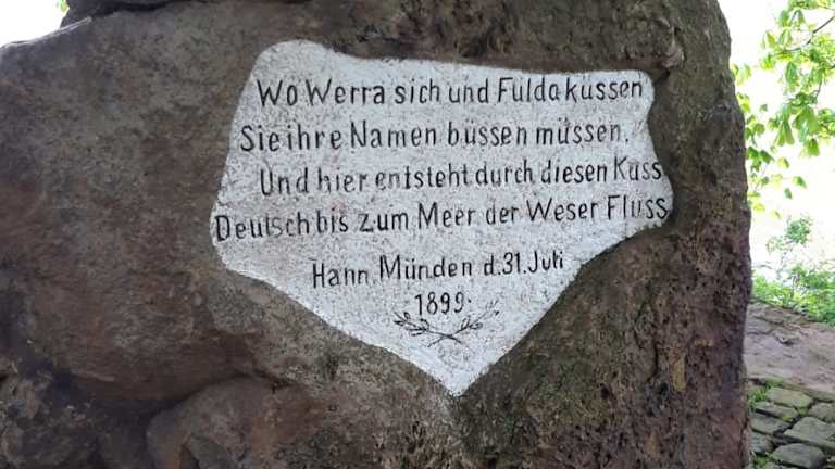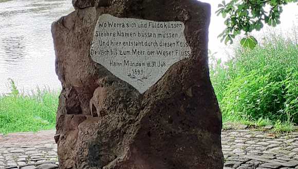 Eine der markantesten Stellen der „Dreiflüssestadt“ Hann.Münden ist wohl die untere Spitze der Insel Tanzwerder, an der mit dem Zusammenfluss von Werra und Fulda die Weser ihren Ursprung findet. An dieser Stelle steht ein 70 Zentner schwerer Gedenkstein, der Weserstein, der 1899 von einem Mündener Industriellen gestiftet wurde und poetische Zeilen trägt, die mit den Worten „Wo Werra sich und Fulda küssen, sie ihren Namen büßen müssen…“ beginnen. Die Stelle ist schön und lädt auf einer runden Bank unter einer alten Kastanie ein, die Weser auf ihren ersten 500 Metern in Ruhe zu betrachten, bevor sie nach weiteren 452 Kilometern in die Nordsee fließt. Der Weserstein lässt sich bequem mit dem Auto erreichen und auf dem Tanzwerder stehen in unmittelbarer Nähe überdies zahlreiche kostenlose Parkmöglichkeiten zur Verfügung. Der Besuch ist nicht nur geografisch lohnend!