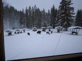 Wildfüffertung im Graswangtal - Rothirsche, nahe Ettal und Linderhof ein Naturererlebnis in nahezu naturbelassenem Gebiet, vor Ettal rechts Richtung Linderhof, bei den Gröbl-Alm gibt es rechts Parkplätze und auf der linken Seite ein Wanderparkpaltz, von dort ca. 15 Min. Gehzeit, Wegweiser zeigt den Weg, zu einer Art Schauhütte mit ca. 50 Plätzen Sitzplätzen und Decken noch vorne zur Beobachtung offen dort stehen die Futterkrippen mit Heu, Rübben und Kastanien werden nach auf dem Boden verteilt, die Tiere warten im nahen Wald und beobachten den Wildhüter, so bald er den Platz verläßt kommen die ersten Tiere näher und es werden immer mehr, bis ca, 80 Hirsche, Hirschkühe und Hirschkälber Fütterung im Dezember und Januar um 16 Uhr, ab Febr. und meist nur bis MIte März um 17 Uhr, Kostenbeitrag Erw. 3 € Kinder über 7 J. 1 € besonders für Kinder ein naturnahes Erlebnis. Miest wird noch Hirschwurst zu einem güsntigen Preis verkauft.