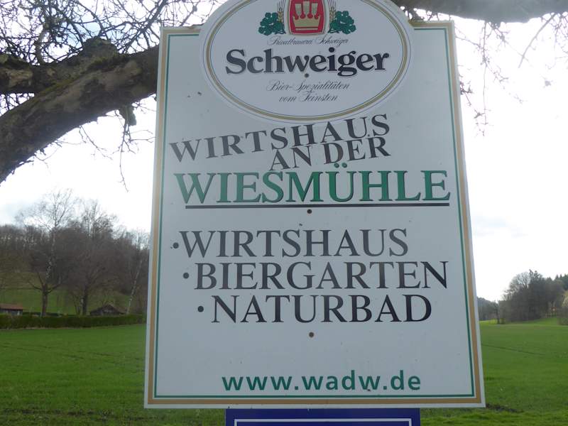 Wir waren bei einem Sonntagsausflug mit unseren Freunden in der Gegend von Glonn im Wirtshaus an der Wiesmühle. Glonn ist eine Gemeinde im Landkreis Ebersberg, südöstlich von München. Das Wirtshaus befindet sich am Eingang eines Wanderweges ins Landschaftsschutz-- gebiet des Kupferbaches. Da man im Internet lesen konnte, „Reservierung empfohlen“, hat unser Freund telefonisch 4 Plätze für 12 Uhr am Sonntag vormerken lassen. Schon beim Eingang zur Gaststätte auf einer kleinen Hinweistafel konnte man lesen: „ Kochen macht glücklich. Essen auch.“ Wir waren überrascht vom gemütlichen, bayerischen Flair im gesamten Wirtshaus. Es war sehr urig, die Einrichtung hat uns sehr gut gefallen. Die Reservation klappte einwandfrei. Wir hatten einen Ecktisch für 4 Personen. Die sehr freundliche und aufmerksame Bedienung brachte uns sofort eine große Kreidetafel, die sie auf einen freien Stuhl stellte, auf dieser Tafel waren die Tagesgerichte vermerkt. Das Angebot auf der Kreidetafel entsprach unseren Vorstellungen. Wir haben uns letztendlich für Schweinebraten mit Kartoffelknödel und Krautsalat (16,90 Euro), Rahmschwammerl (17,90 Euro), Rote Beete Risotto mit Ziegen-Käsepralinen (17,90 Euro) und Gnocchi aus Süßkartoffeln mit Gemüse (17,90 Euro) entschieden. Zum Essen tranken wir drei Zwickl Wildbräu und einen Spezi. Das Essen und die Getränke wurden uns in kurzer Zeit gebracht. Das Essen schmeckte uns sehr gut und auch die Portionen waren vollkommen in Ordnung. Freundliches Personal und gemütliches Ambiente. Was will man mehr, wir können das Wirtshaus an der Wiesmühle weiterempfehlen. Zum Wirtshaus gehört auch ein Biergarten und ein kleines Naturbad. Das Bad wird vom Kupferbach gespeist und ist laut Internet für seine gute Wasserqualität bekannt. Zum Freibad gehört auch eine große Liegewiese. Vor der Gaststätte stand ein geschmückter Osterbaum. Der Osterbaum ist eine alte deutsche Tradition, die sich mittlerweile in ganz Europa verbreitet hat. Er symbolisiert die Ankunft des Frühlings. Hinter dem Wirtshaus befand sich auch ein Spenden-Flohmarktstand.