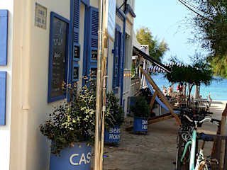 Es ist gleichgültig ob man von Llucmayor, Campo oder von Santanyi in den Ort hinein fährt, man kann man sich rechts zur Hotelzone halten oder nach links zum Hafen. Empfehlen kann ich, das Auto rechts auf dem Passeig de la Rosa abzustellen und dann zum Meer über die Straße Pou d`en Verdara zu gehen . Hier ist es nicht so mondän, wie man das erwartet hat, Hotels stehen Mitte Mai noch teilweise unbewohnt oder ganz geschlossen, aber der Rundweg zwischen den Hotels und Meer, welches von Felsen abgeschlossen ist, hat seinen Reiz. Fast kommt man sich vor, am Ende der Welt gelandet sein, oder es ist ganz nahe. Der Blick über das Meer zeigt aber die riesige Bucht in weiter Ferne, Wald und Strandzone, genannt Es Trenc. An diesem Strand sind auch gute Restaurants zu finden, ein Fernglas wäre jetzt hilfreich. Je weiter man kommt, sieht man den nahen Strand von Estanys, der mit einigen Wassersportmöglichkeiten versehen ist. Dahinter aber in einiger Entfernung beginnt der Strand von Es Trenc, ein Eldorado für Leute die ihre Ruhe haben wollen. Um zu diesen Strand zu kommen braucht man ein Auto, wenn man in der Hotelzone wohnt, mietet man ein Fahrrad. Wir sind aber noch auf unserem Rundgang durch Sant Jordi, verlassen die Hotelzone und fahren zum Hafen, vorher sehen wir noch die Salinen von d`es Avall, hier kann man nicht eintreten, aber einige Salzhügel sehen. Der Hafen hat seinen eigenen Reiz den ich gesondert bewertet habe.