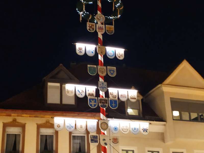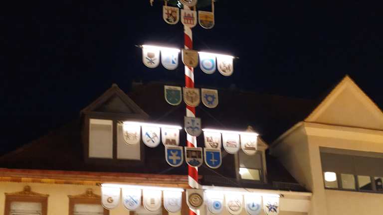 Der Zunftbaum auf dem Alten Marktplatz in Speyer ist 18 Meter hoch und mit 29 Zunftzeichen geschmückt. Der Baum wird wohl jedes Jahr neu aufgestellt und repräsentiert die lokalen Handwerksbetriebe.