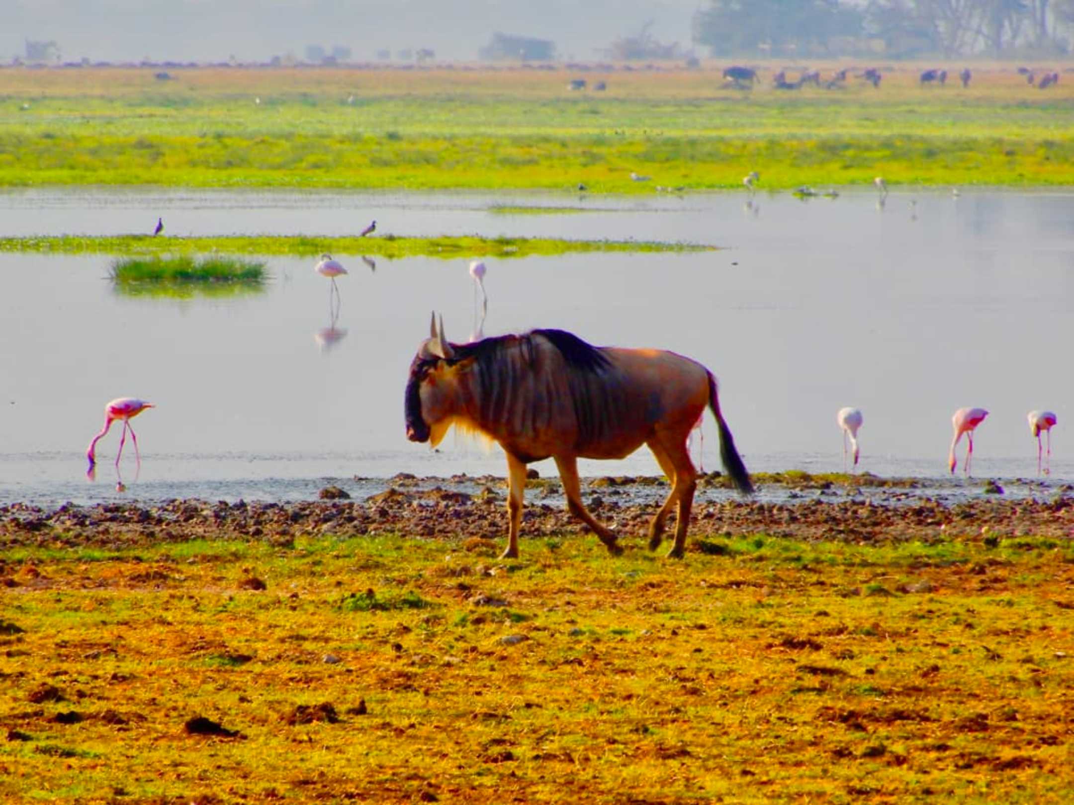 Flamingos und Gnu