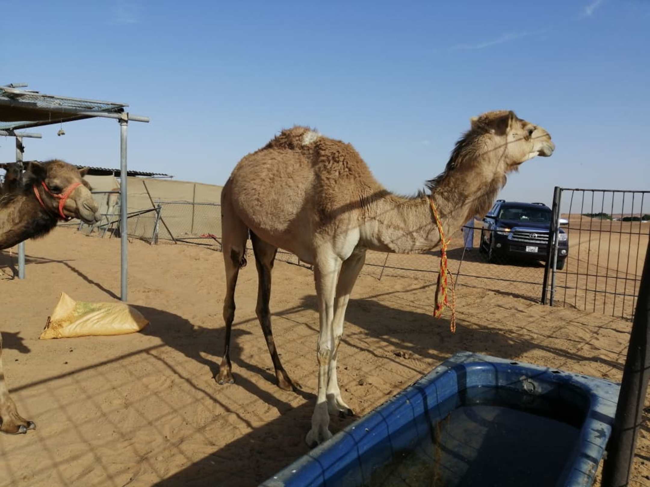 Die Kamelfarm, im Hintergrund der Geländewagen