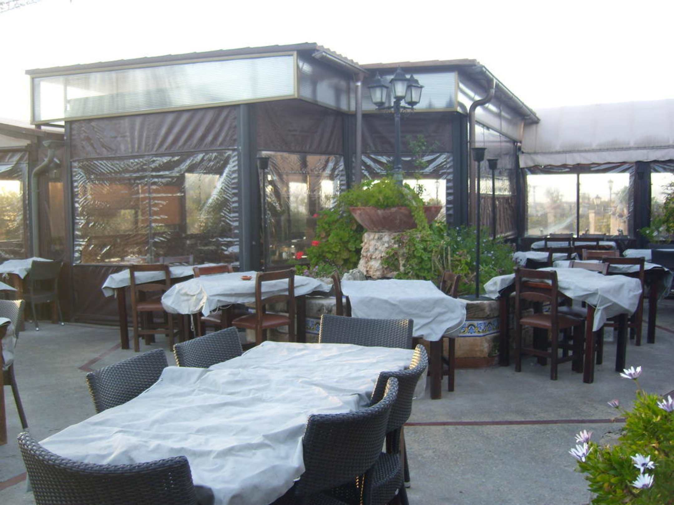 Tische draussen, im Februar abgedeckt